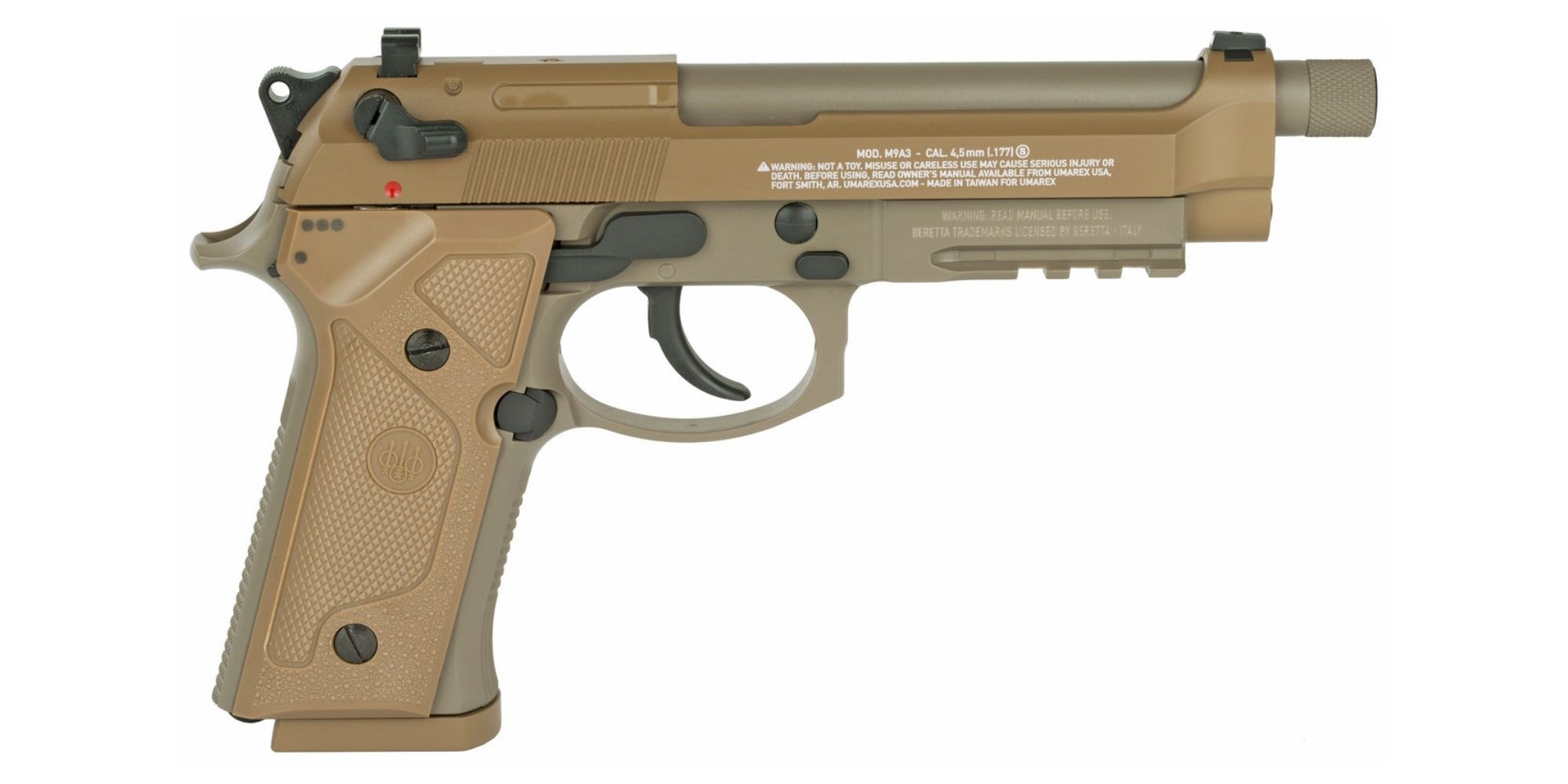 Everything about this Beretta M9A3 air pistol screams range time! This officially licensed handgun from Umarex Airguns is a stunning replica of Beretta’s 9mm powder burner handgun; however, it is equipped with a special mode. With a simple flip of the switch on the right side of the hand guard this Beretta goes full-auto! Whether using the happy switch or doing handgun drills, you’ll enjoy the realism of the M9A3, right from its unique FDE coloring and authentic grip and feel, down to its realistic blowback action slide. Its full size magazine gives you the ability to practice reloads, and it holds a single 12 gram CO2 cartridge, along with 18 BBs. Its authentic safety makes this an air pistol for both left- or right-handed shooters, and the clean, single or double action trigger, functions just like the powder burner. For fun full automatic BB gun action there's nothing like the Beretta M9A3 air pistol. Beretta Trademarks licensed by Beretta.
